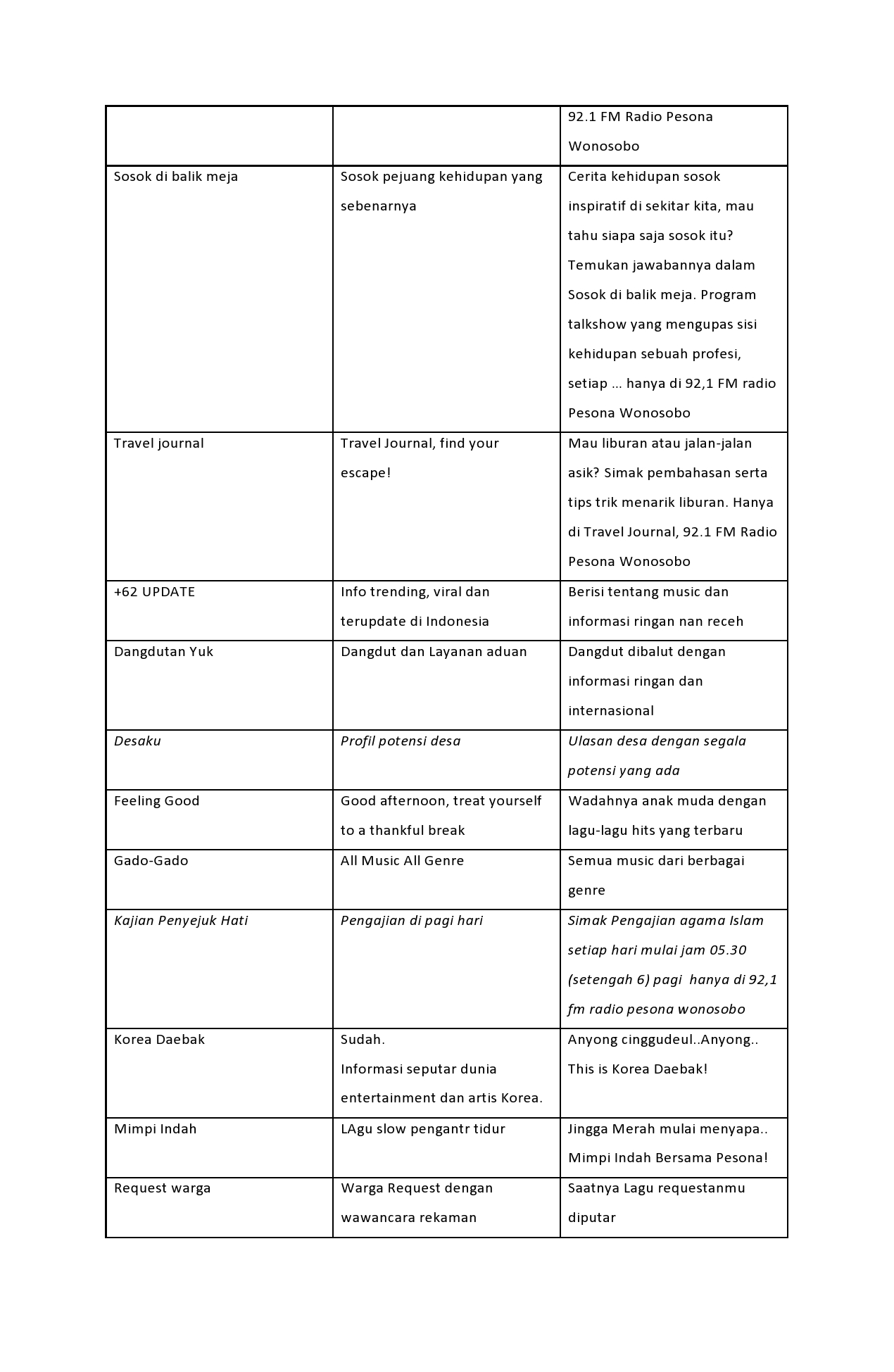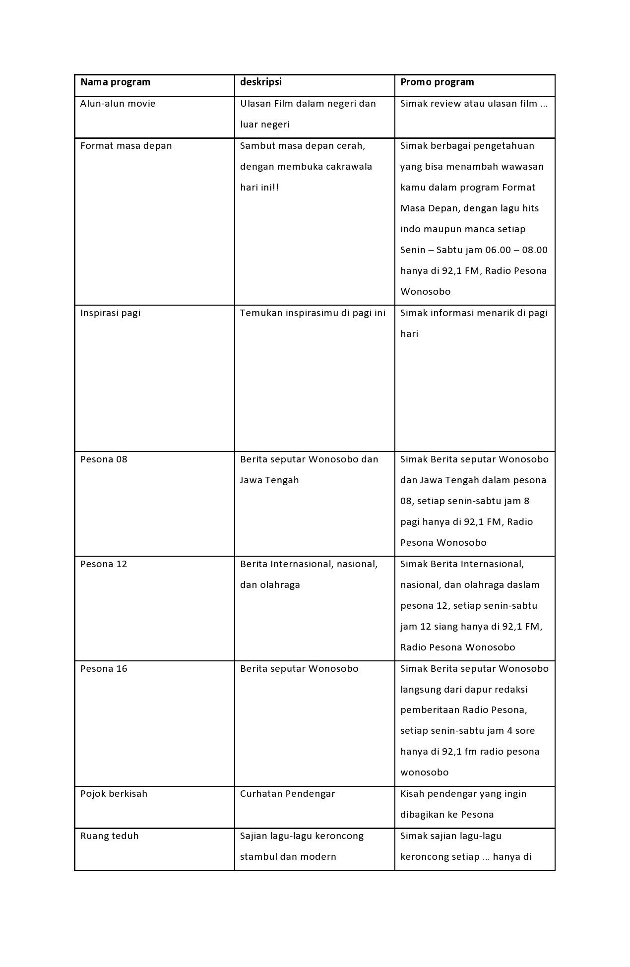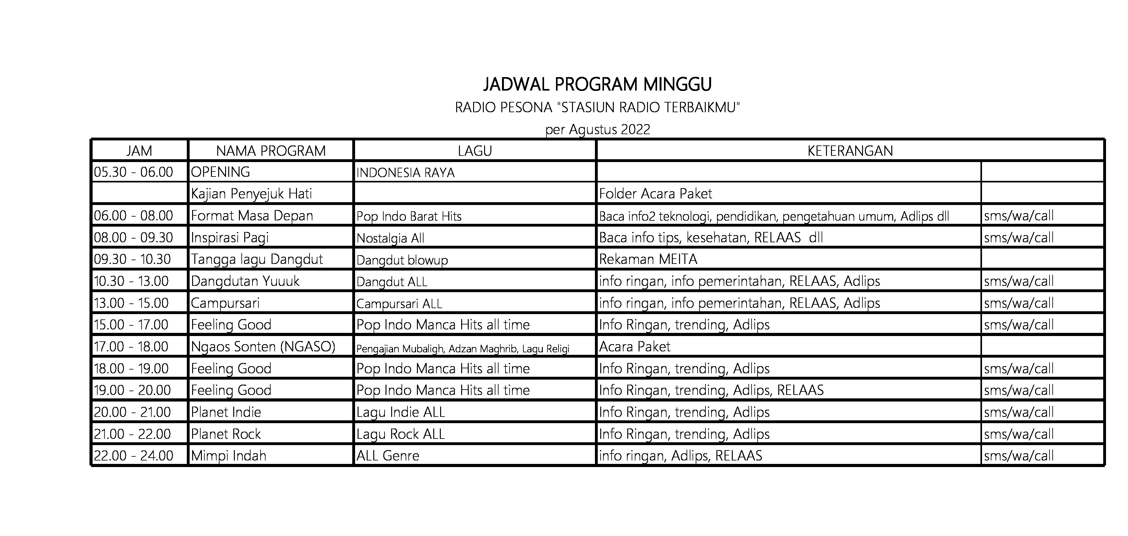 Informasi jadwal siaran harian dan acara spesial dari Pesona FM Wonosobo.